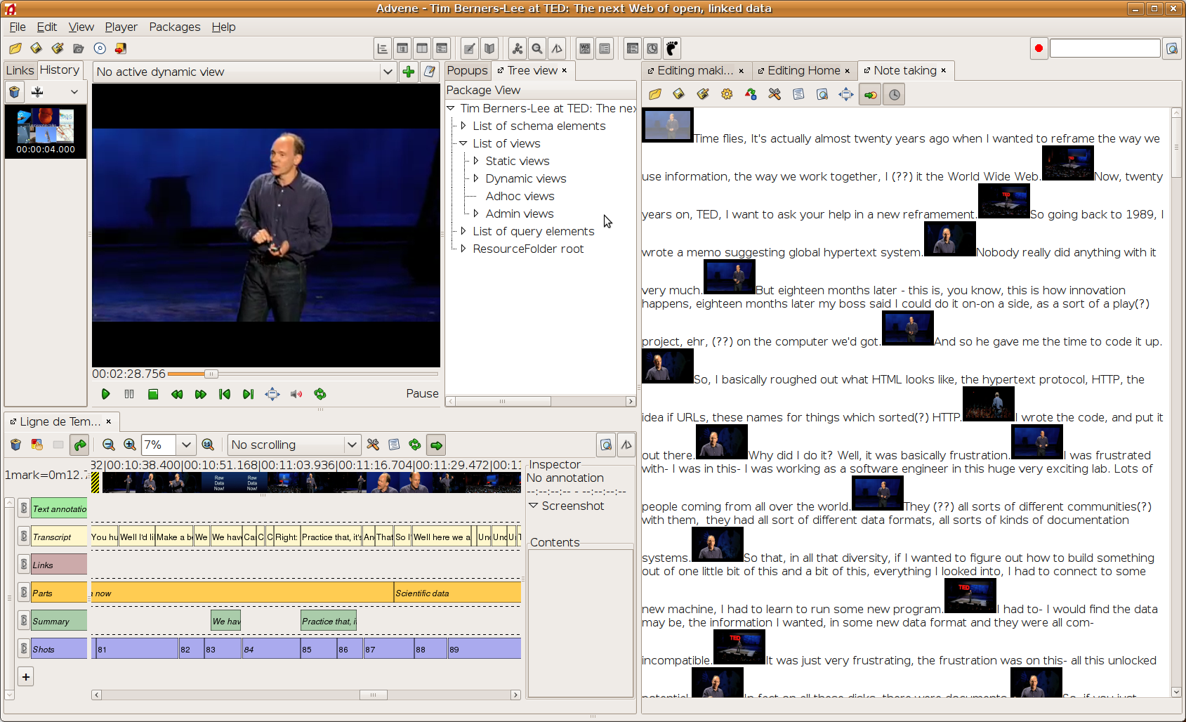 As a rule of thumb, it is often a good idea to start with the Player > Detect shots function of Advene, in order to get a first structure of annotation. In this particular case, however, this has not proven very useful, because Shots are not aligned with the speech, which is the primary interest of the video.